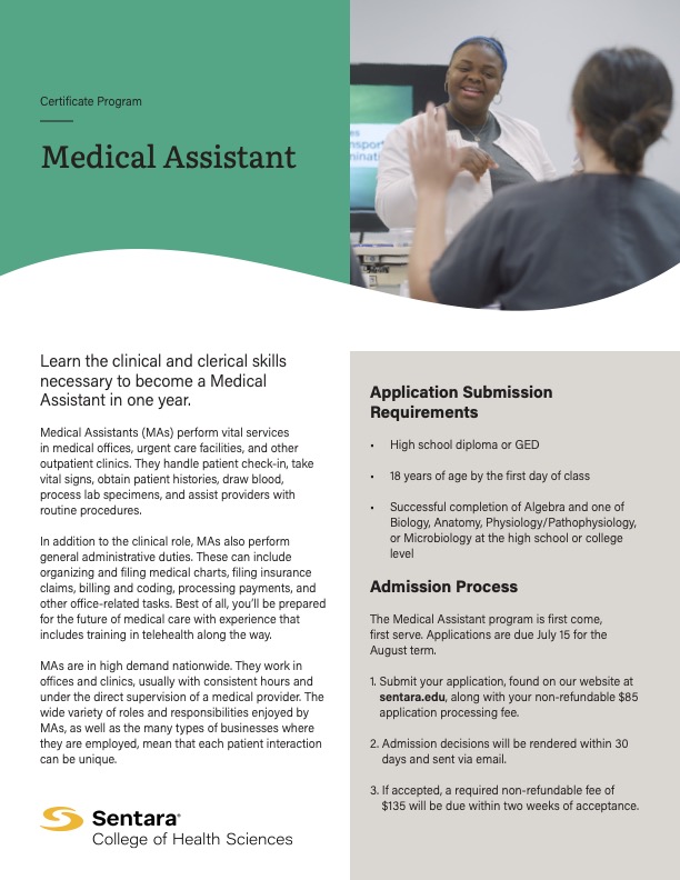 • Prepares you to work as a Medical Assistant at Sentara or nationwide.